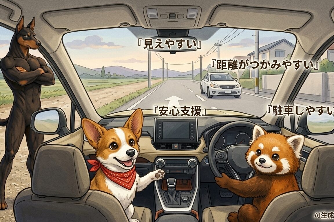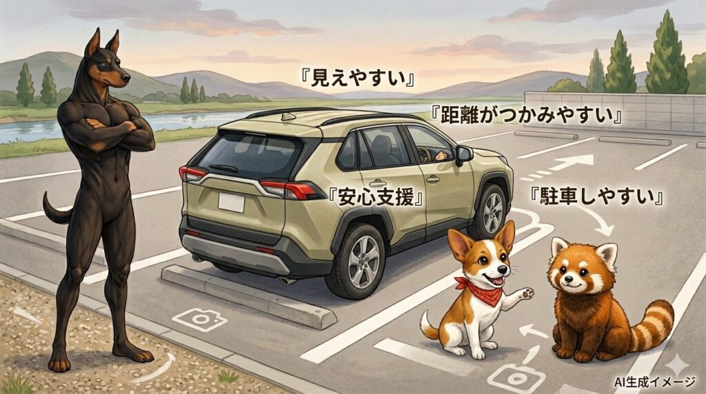 初心者が一番怖いのは「車の四隅がどこにあるか分からないこと」ですよね。 実は、RAV4のようなSUVは、背が低いコンパクトカーよりも圧倒的に「自分の車の居場所」がつかみやすいんです